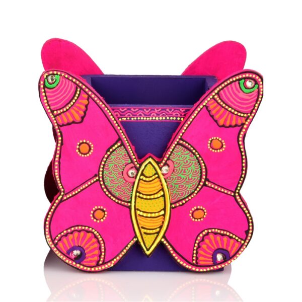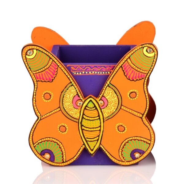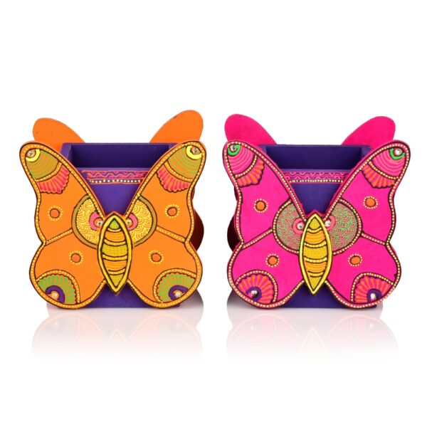 Brighten up your workspace with artistic charm and everyday functionality using this Hand Crafted Premium Wooden Butterfly Motif Pen Stand. Beautifully designed and carefully hand-painted by skilled artisans, this pen stand is a perfect blend of traditional craftsmanship and modern utility. Made from high-quality wood, it offers durability while adding a vibrant decorative accent to your desk, study table, or office space. The elegant butterfly motif symbolizes creativity, transformation, and positivity, making this pen stand more than just a stationery holder—it’s a statement décor piece. Intricate folk-art patterns, fine detailing, and lively colors give each piece a unique personality. Available in two striking color options – Orange and Pink, both variants instantly add warmth and character to any setting. Designed for practical use, the pen stand features a spacious compartment that neatly holds pens, pencils, markers, scissors, and other daily essentials, helping keep your workspace clutter-free. Its sturdy wooden construction ensures stability, while the smooth finish makes it safe and easy to use. This butterfly pen stand makes a thoughtful gift for students, professionals, artists, and décor lovers. It’s ideal for birthdays, housewarmings, return gifts, or corporate gifting. Choose to buy it as a single decorative piece or opt for a set of two, perfect for coordinated desk styling or gifting pairs. Eco-friendly and handcrafted, it reflects conscious living and supports traditional artisans. Whether placed at home or office, this wooden butterfly pen stand adds a cheerful pop of color and handcrafted elegance to everyday organization.