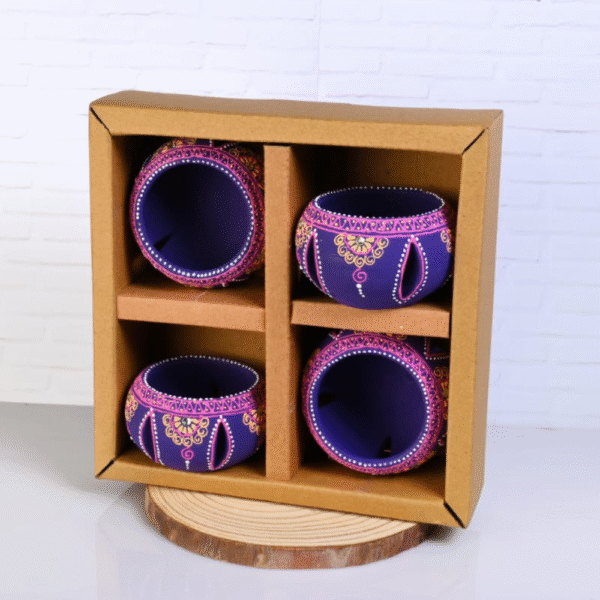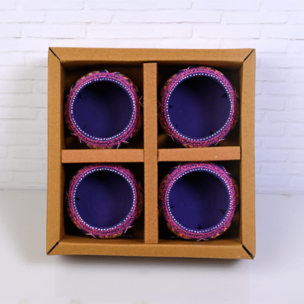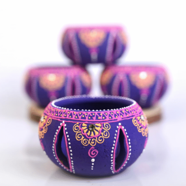 Add a touch of royal elegance and warm ambience to your home with this Handcrafted Terracotta Jali Round Tealight Holder Set of 4 in Purple. Expertly handmade by skilled Indian artisans, these tealight holders are crafted from natural terracotta clay and finished with rich purple tones accented by intricate hand-painted detailing. The traditional jali-style cutwork allows light to gently filter through, creating a soothing glow and beautiful shadow patterns. Designed to hold standard tealights or small diyas, these round T-light holders are perfect for Diwali décor, festive celebrations, pooja spaces, weddings, candlelight dinners, and home décor styling. The sturdy terracotta construction ensures durability, while the breathable clay material helps manage heat safely during use. Each piece reflects authentic craftsmanship, making every holder slightly unique. Eco-friendly and reusable, this terracotta tealight set is a sustainable alternative to mass-produced décor items. Whether placed on center tables, balconies, temple shelves, or paired with festive rangoli arrangements, these holders instantly uplift the mood with warmth, elegance, and tradition. Their compact yet striking design makes them ideal for both everyday décor and special occasions. This set of 4 also makes a thoughtful gift for Diwali, housewarmings, weddings, or festive hampers—symbolizing light, positivity, and artistic heritage. With its blend of traditional design and contemporary color, this handcrafted tealight holder set is a timeless addition to any décor collection.