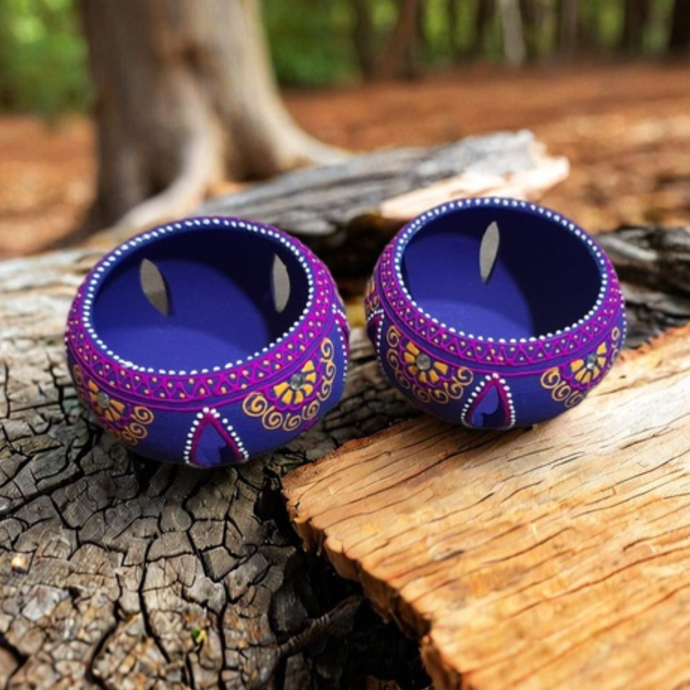 Add a touch of royal elegance and warm ambience to your home with this Handcrafted Terracotta Jali Round Tealight Holder Set of 4 in Purple. Expertly handmade by skilled Indian artisans, these tealight holders are crafted from natural terracotta clay and finished with rich purple tones accented by intricate hand-painted detailing. The traditional jali-style cutwork allows light to gently filter through, creating a soothing glow and beautiful shadow patterns. Designed to hold standard tealights or small diyas, these round T-light holders are perfect for Diwali décor, festive celebrations, pooja spaces, weddings, candlelight dinners, and home décor styling. The sturdy terracotta construction ensures durability, while the breathable clay material helps manage heat safely during use. Each piece reflects authentic craftsmanship, making every holder slightly unique. Eco-friendly and reusable, this terracotta tealight set is a sustainable alternative to mass-produced décor items. Whether placed on center tables, balconies, temple shelves, or paired with festive rangoli arrangements, these holders instantly uplift the mood with warmth, elegance, and tradition. Their compact yet striking design makes them ideal for both everyday décor and special occasions. This set of 4 also makes a thoughtful gift for Diwali, housewarmings, weddings, or festive hampers—symbolizing light, positivity, and artistic heritage. With its blend of traditional design and contemporary color, this handcrafted tealight holder set is a timeless addition to any décor collection.