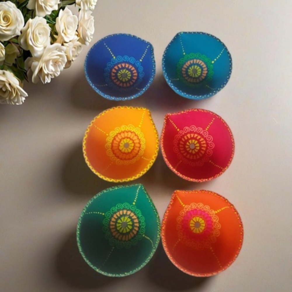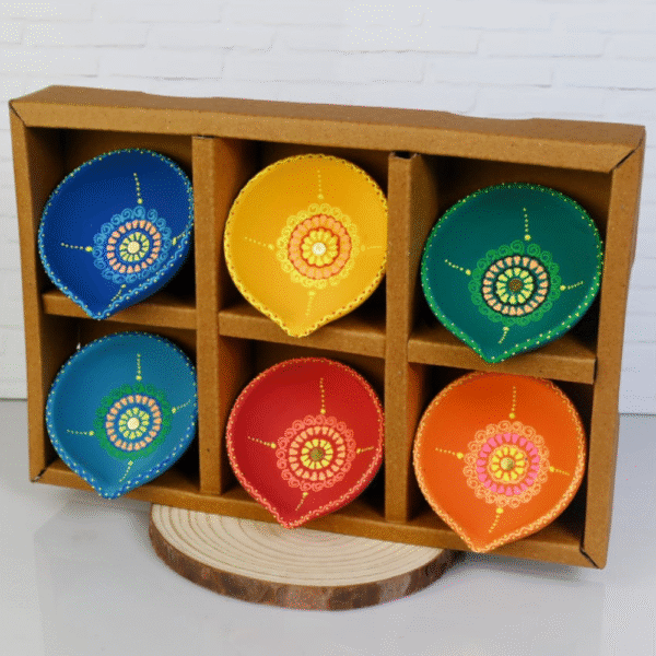 Celebrate the warmth and joy of festivals with this Handcrafted Terracotta Sada Panti Diwali Diya Set of 6, beautifully made by skilled Indian artisans using natural clay. These traditional terracotta diyas reflect timeless Indian craftsmanship and are thoughtfully hand-painted in rich, vibrant colors with elegant panti-style detailing. Each diya carries a classic shape and balanced design that enhances its traditional appeal. Perfect for Diwali celebrations, daily pooja, Navratri rituals, weddings, and housewarming décor, these diyas bring a divine glow and positive energy to your home. The natural terracotta material ensures steady burning of oil or ghee, while the sturdy handcrafted form offers durability and long-lasting use. Their compact size makes them ideal for rangoli decorations, temple corners, balconies, stairways, and festive table setups. This sada panti diya set comes beautifully arranged, making it not only functional but also visually pleasing. The earthy charm of terracotta combined with colorful hand-painted accents adds a festive yet elegant touch to any space. These diyas are eco-friendly, reusable, and a sustainable alternative to mass-produced decorative lighting. Whether you are decorating your own home or looking for a thoughtful festive gift, this handcrafted diya set is a perfect choice. It symbolizes light, prosperity, and tradition, making it a meaningful addition to any celebration rooted in Indian culture.