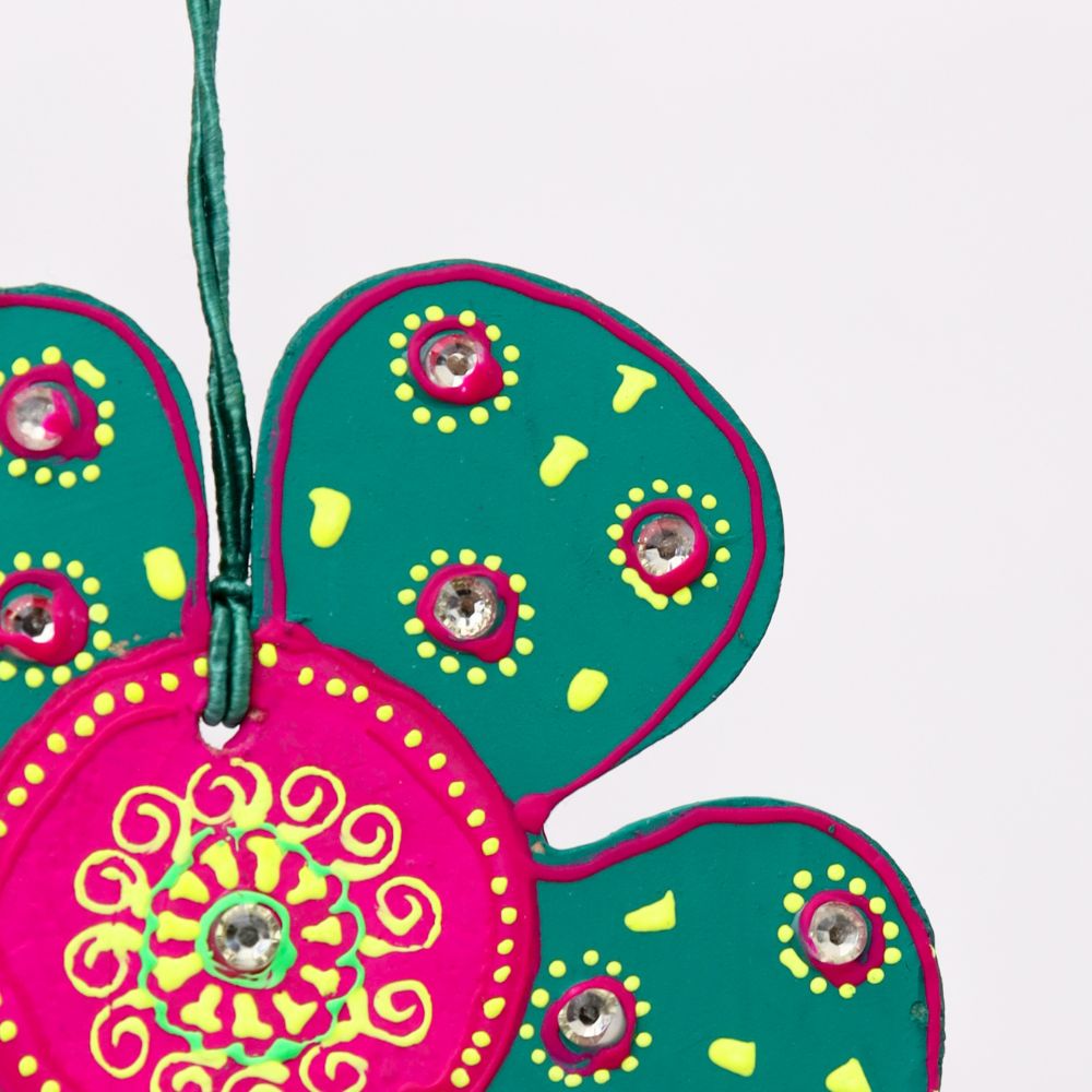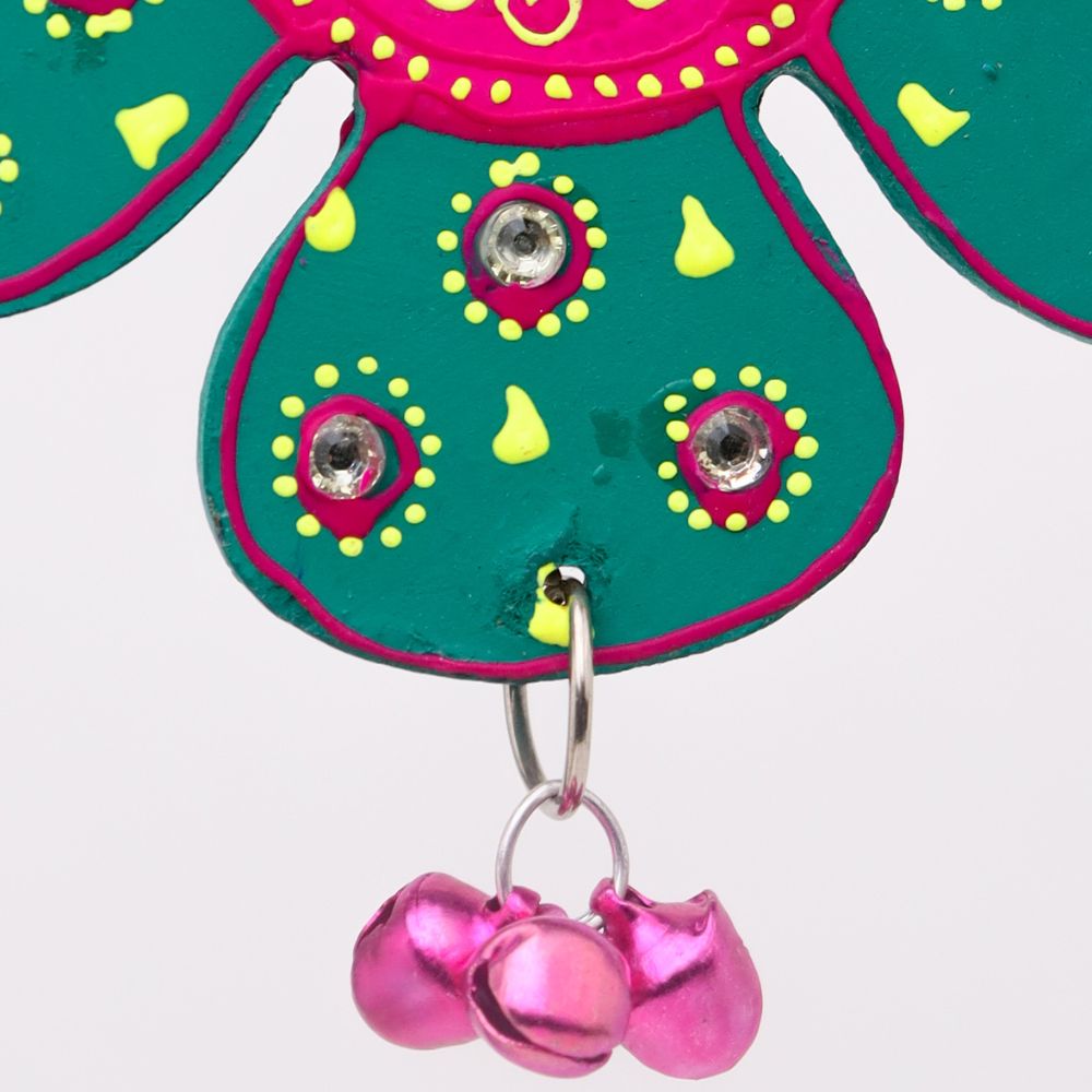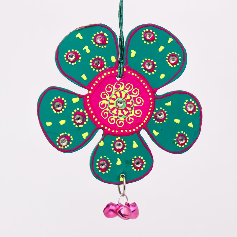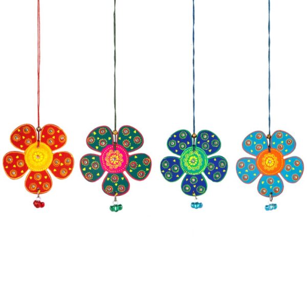 Handcrafted wooden flower hangings in Red, Green, Blue, and Sky Blue