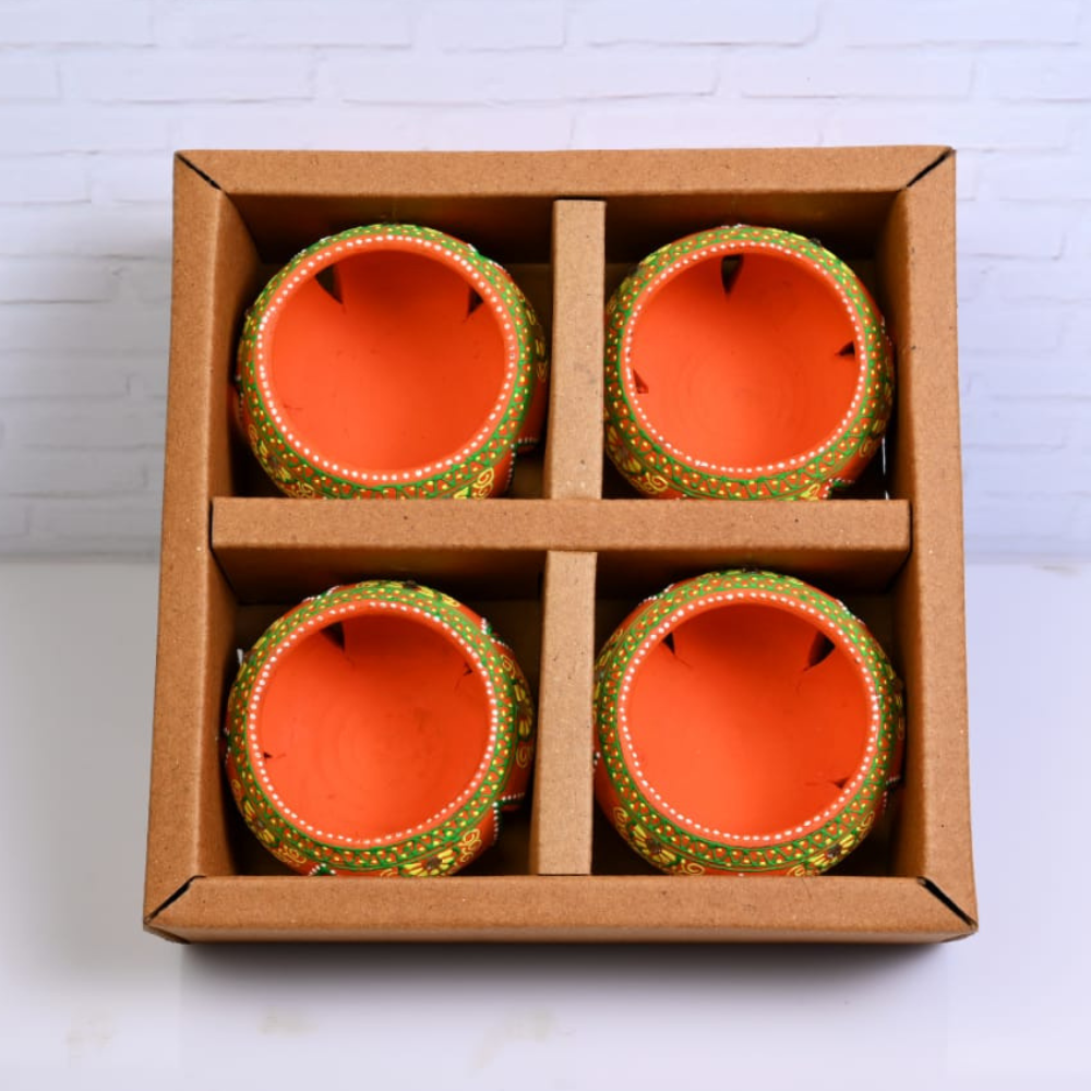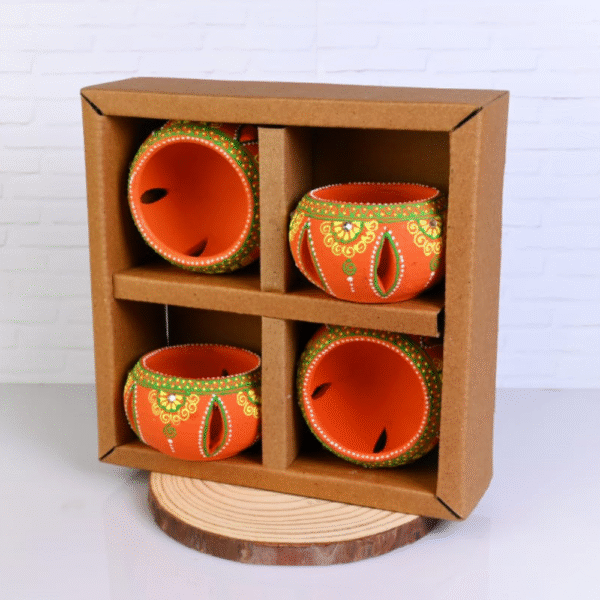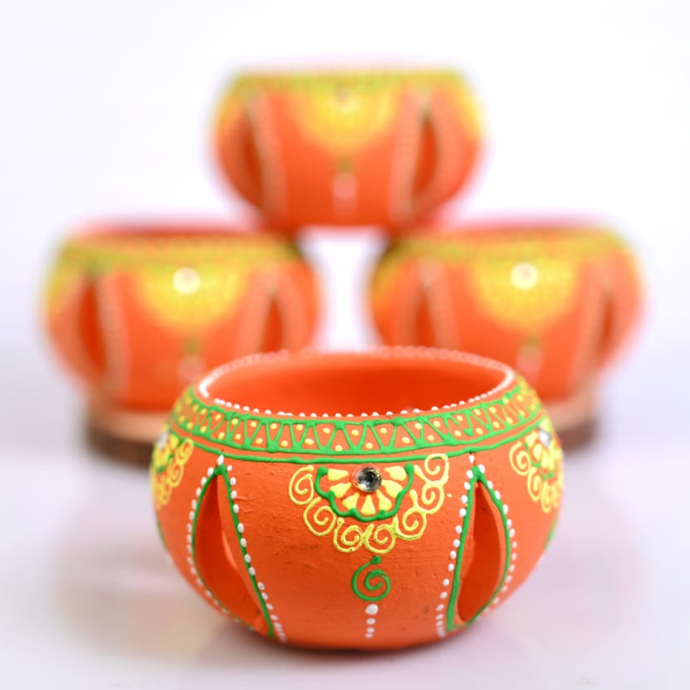 Brighten your festive décor with this Handmade Terracotta Jali Round Diya Tea Light Holder Set of 4 in Orange, crafted with care by skilled Indian artisans. Made from natural terracotta clay, these diya holders showcase a beautiful jali cutwork design combined with vibrant orange tones and intricate hand-painted detailing. When lit, the cutwork allows the light to softly glow through, creating a warm, welcoming ambience. Perfect for Diwali celebrations, pooja rituals, festive décor, weddings, and everyday home styling, these round diya holders are designed to hold tea lights or small diyas securely. The terracotta material is heat-resistant and breathable, ensuring safe and steady use while enhancing the traditional charm of your space. Each piece is handcrafted, giving it a unique character that reflects authentic Indian artistry. Eco-friendly and reusable, this diya set is an excellent sustainable alternative to disposable festive lighting. Place them on rangoli designs, temple shelves, balconies, window sills, or dining tables to instantly elevate the décor with a touch of tradition and elegance. Their compact size makes them easy to style while still making a striking visual impact. This orange terracotta jali diya set also makes a thoughtful gift for Diwali, housewarmings, weddings, and festive hampers, symbolizing light, positivity, and prosperity. With its blend of traditional craftsmanship and vibrant color, this set is a timeless addition to any festive or home décor collection.