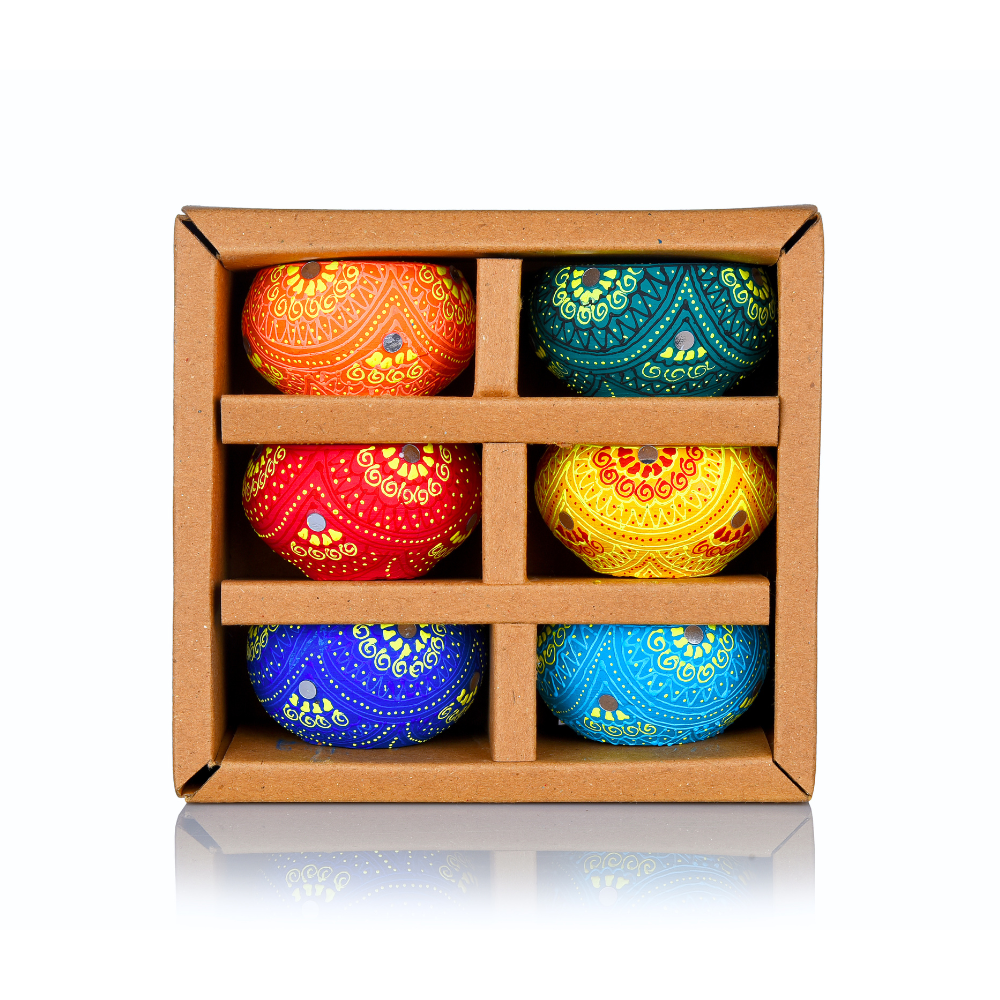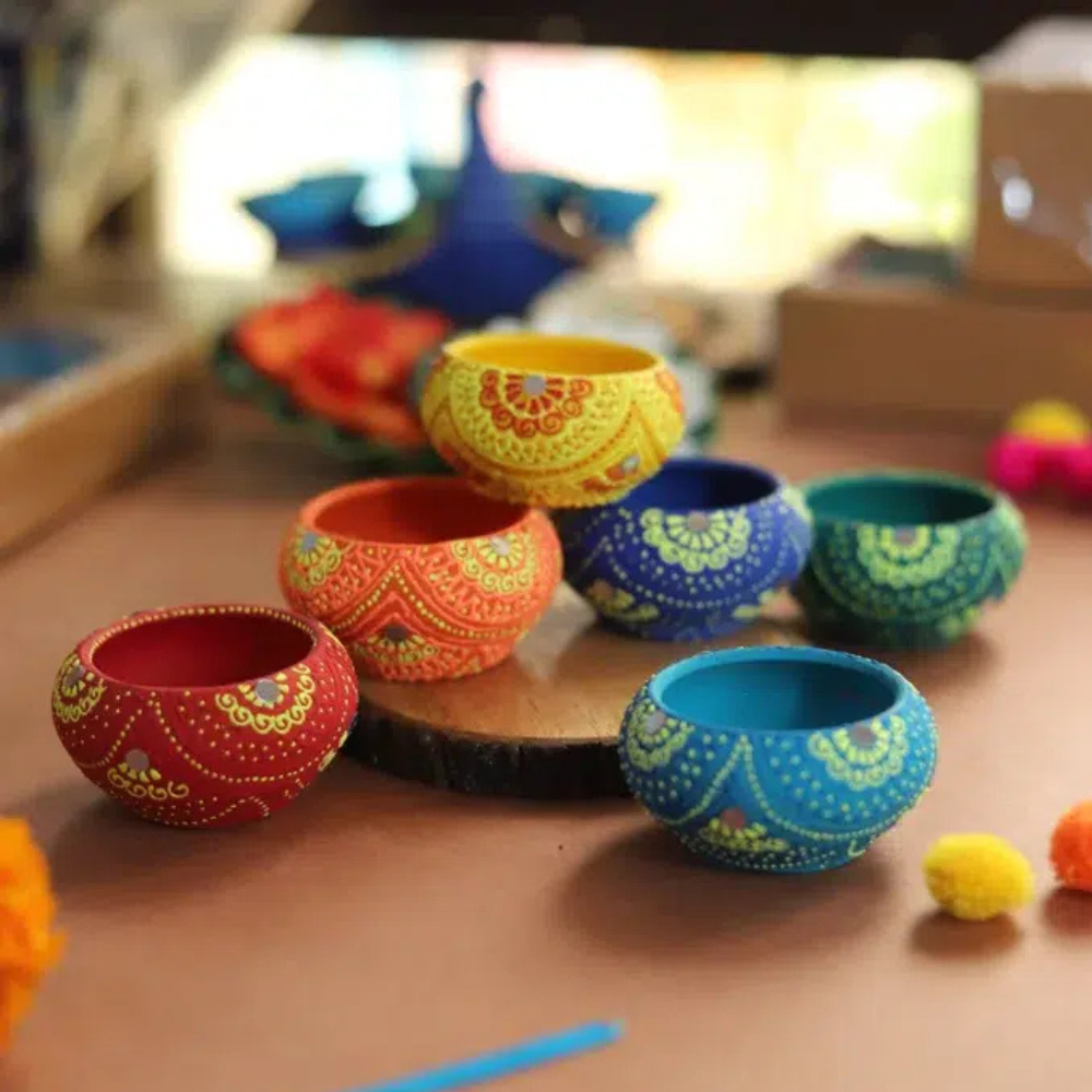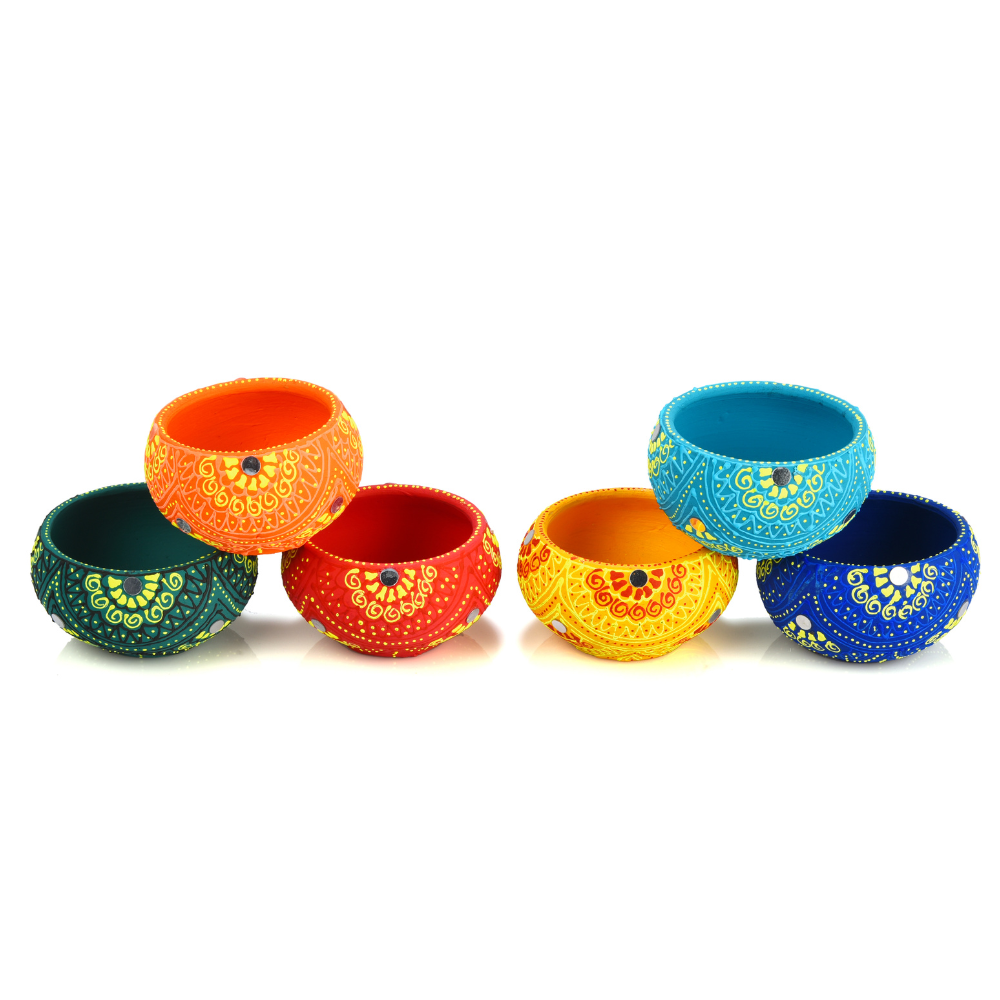 Enhance your home décor with this stunning Handmade Terracotta Round Tea Light Holder Set of 6, crafted to bring warmth, color, and traditional charm to any space. Each tea light holder is made from premium natural terracotta and hand-painted with intricate patterns, making it a perfect blend of artistry and durability. The vibrant colors—yellow, blue, orange, green, red, and royal blue—create a festive ambiance ideal for Diwali décor, home decoration, festive lighting, and gifting. These decorative T-light holders are designed to hold standard tea lights, offering a soft, glowing illumination that beautifully enhances your living room, puja room, balcony, dining table, or entryway. Their handcrafted detailing ensures that each piece is unique, adding an elegant ethnic touch to your festive celebrations or everyday décor. Whether you’re looking for Diwali T-light holders, terracotta diya sets, or handmade home décor items, this set of 6 is a perfect choice. It also makes a thoughtful gift for housewarmings, festivals, weddings, and special occasions.