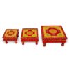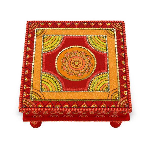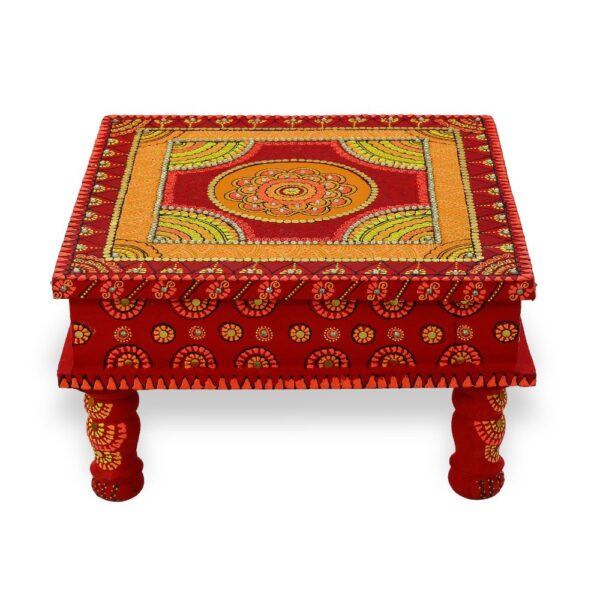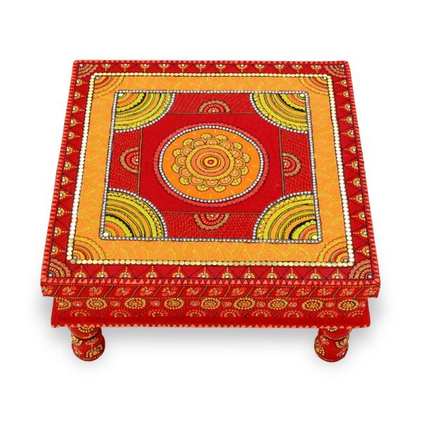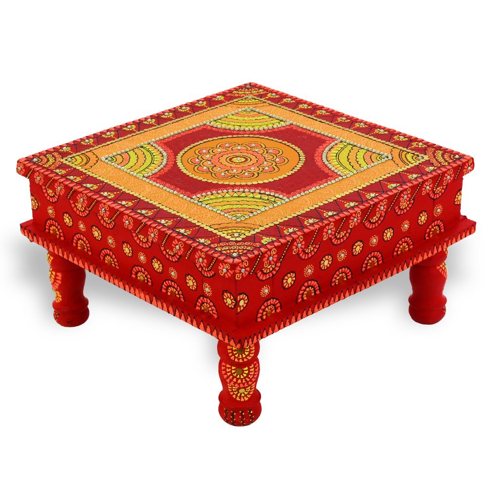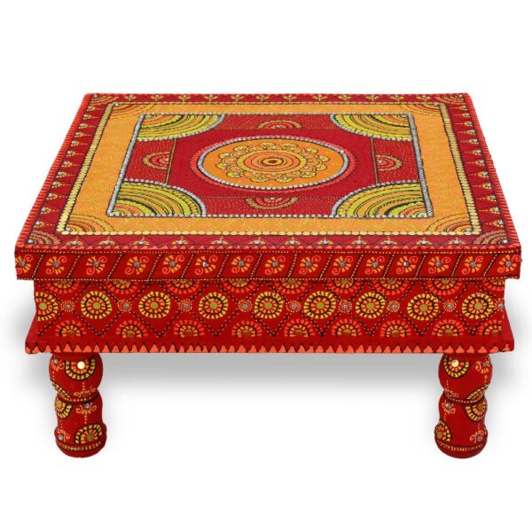 Enhance your sacred space with this Handmade Wooden Pooja Chowki Chourang in Red and Yellow, a beautifully crafted platform designed to elevate your daily prayers and festive rituals. Skillfully handmade by experienced artisans, this traditional chowki features intricate hand-painted patterns inspired by Indian folk art, making it both a functional pooja essential and a striking decorative accent. Crafted from durable, high-quality wood, the chowki offers excellent stability and long-lasting strength. The vibrant red and yellow color combination symbolizes prosperity, positivity, and devotion, making it ideal for placing idols, diyas, kalash, or sacred books. Its smooth finish and finely detailed motifs add a rich cultural charm to your home temple, living area, or festive setup. This wooden pooja chowki is available in four versatile sizes to suit different needs—whether for compact home mandirs or grand ceremonial arrangements. From daily pooja rituals to Diwali, Navratri, housewarming ceremonies, and weddings, this handcrafted chourang enhances every occasion with traditional elegance. It also makes a thoughtful and meaningful gift for religious events and spiritual milestones. Designed to blend tradition with durability, this chowki is easy to maintain and complements both classic and contemporary interiors. Add an authentic touch of Indian craftsmanship to your spiritual décor with this timeless wooden pooja chowki.